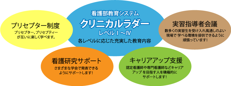 4月 新人入職時研修 5月 採血研修 6月 トランスファー研修 8月 リフレッシュ研修(アロマキャンドル作り、座談会) 10月 アサーティブ研修 11月 ACLS研修 12月 疾患研修(統合失調症について) 1月 薬剤管理 3月 振り返り
